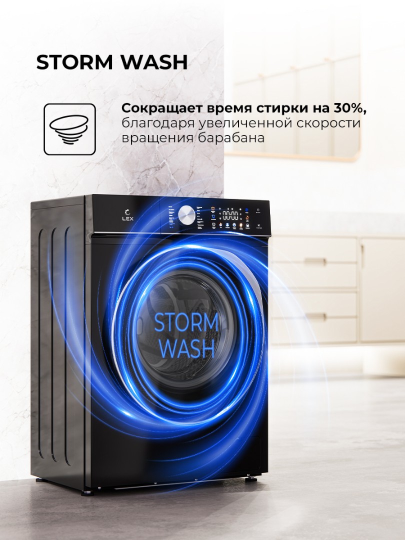 - Storm Wash: ускоряет процесс стирки за счет более интенсивного, но плавного увеличения оборотов. Качественная стирка за 15 минут — это реально! Интеллектуальная система автоматически определит вес белья и установит оптимальное время стирки.