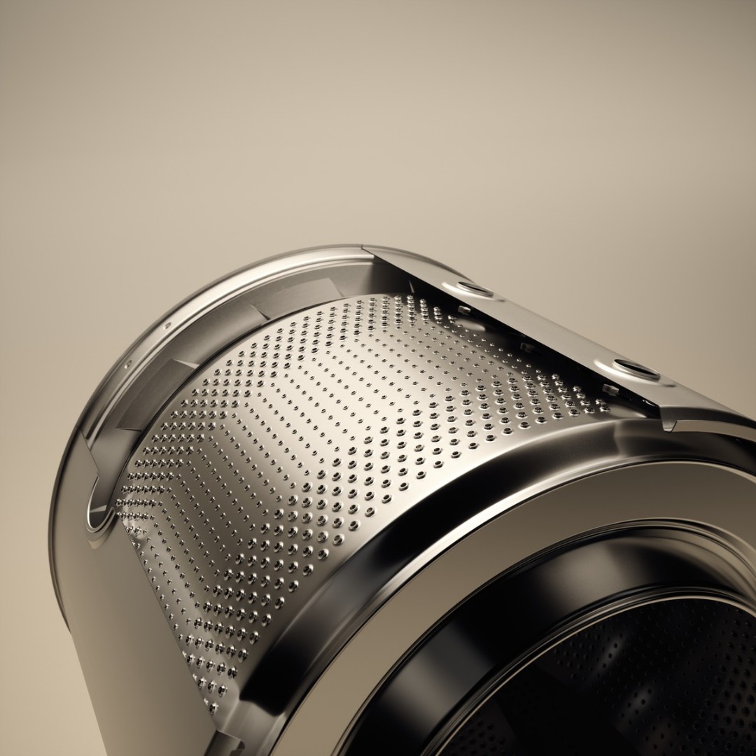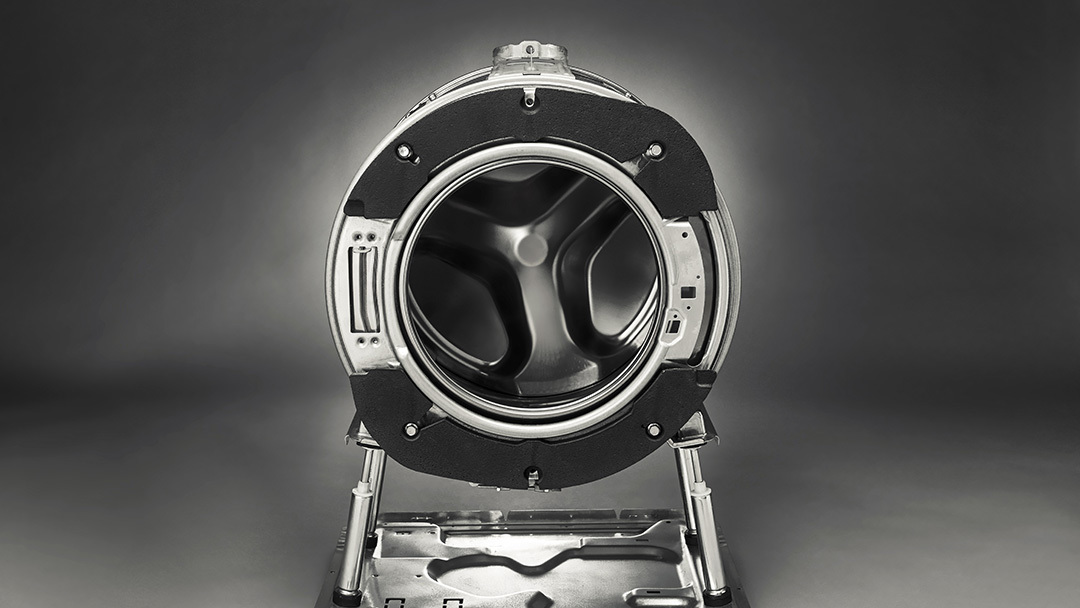 - Дизайн: Белый корпус + пластиковая глянцевая панель + поворотный регулятор и дверца люка с алюминиевой окантовкой