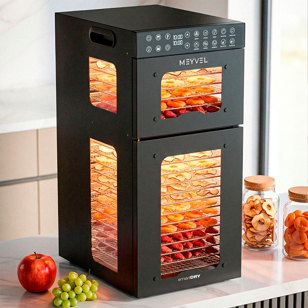 Meyvel MDH20-1S2 (Чёрный) (Black) — это современный дегидратор, который создан для тех, кто хочет заготавливать фрукты, овощи, мясо, травы и ягоды без потери их вкуса и пользы круглый год. Прочный корпус, продуманная конструкция и умная электроника превращают его в надёжного помощника на каждый сезон.