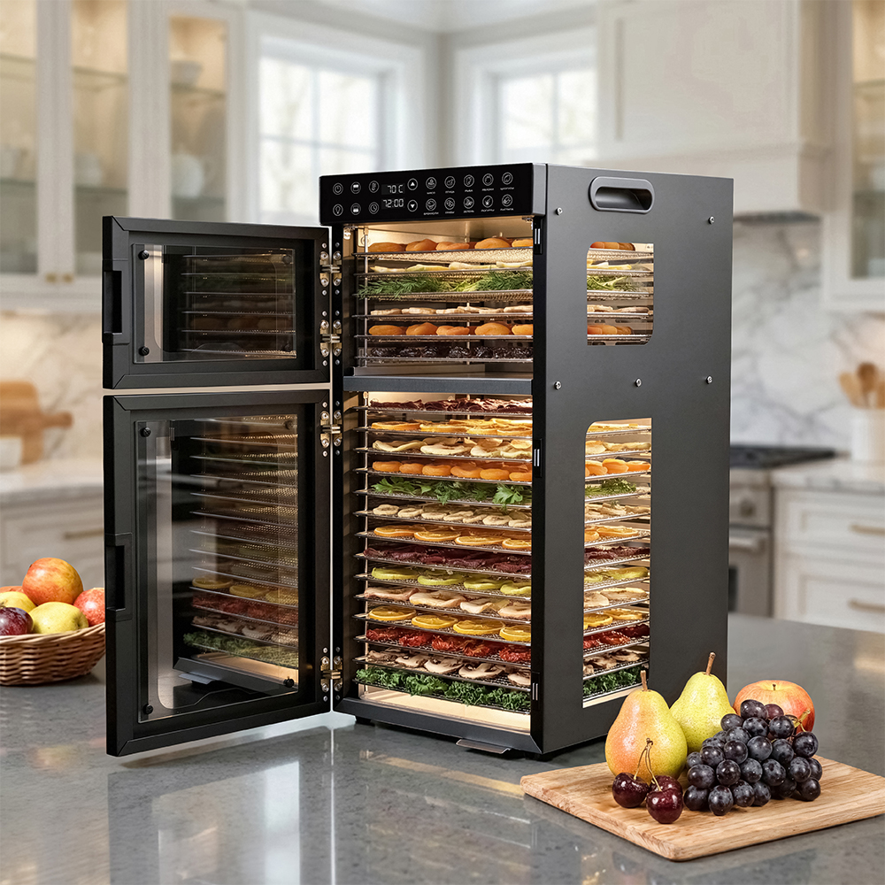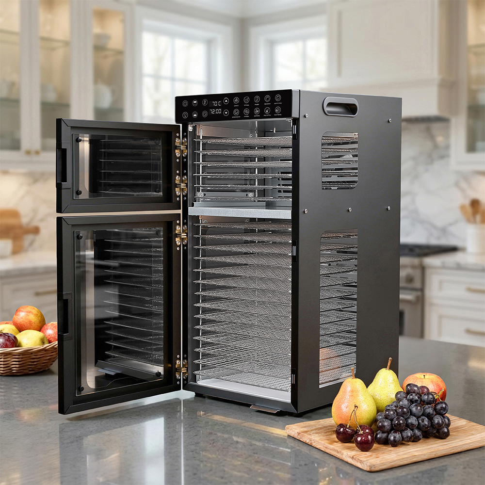 Чёрный корпус из нержавеющей стали, устойчивый к нагреву, влаге и коррозии, выглядит лаконично и современно, легко вписывается в интерьер кухни или мастерской. Внутри установлено 20 поддонов из нержавеющей стали с зазором 25 мм — этого достаточно, чтобы удобно размещать ломтики фруктов, травы или мясные полоски