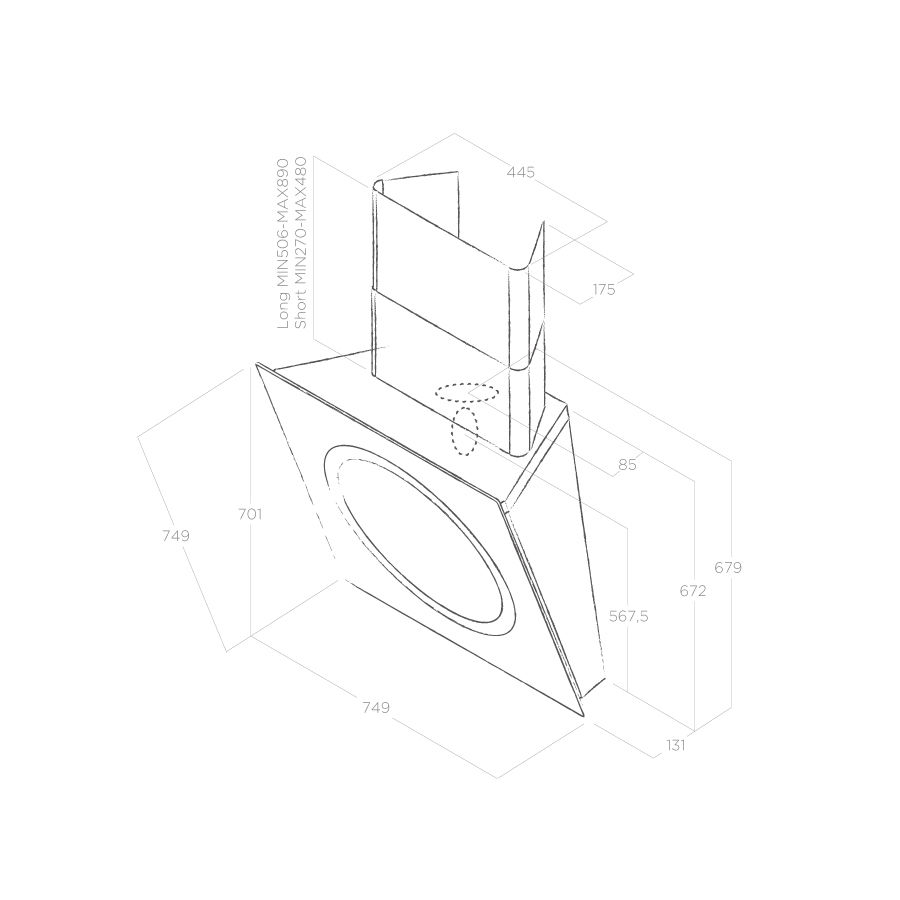 глубина указана по верхней части вытяжки. использование фильтра длительного пользования Long Life Filter. функция Back aspiration. при покупке высокого короба высота вытяжки составит 50.6-89 см. при покупке низкого короба высота составит 27-48 см |