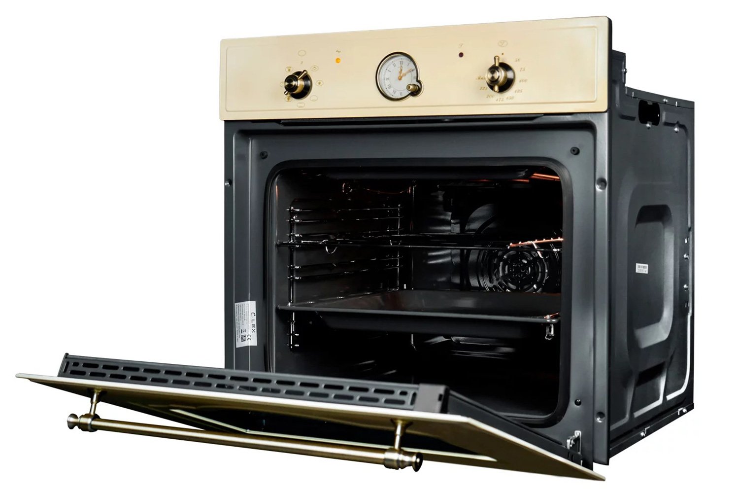 Встраиваемый электрический духовой шкаф LEX EDM 078 C IV цвета айвори с механическим управлением объединяет красоту ретро эстетики и современный функционал. Аналоговый таймер, стильные ручки под старину и двойное стекло ретро формы дополняют образ.