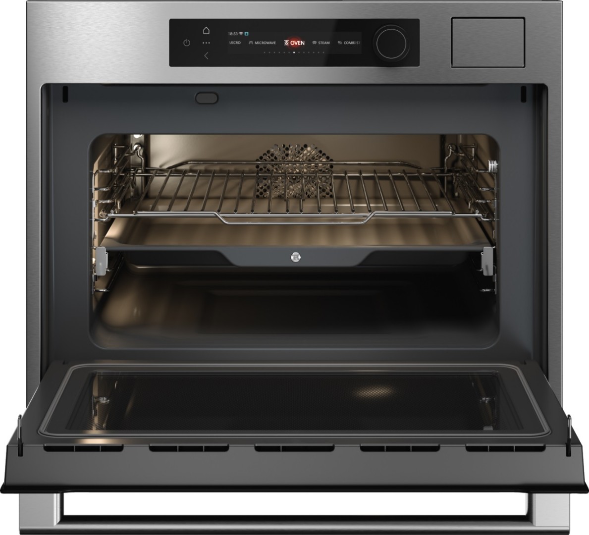 - Комплектация: 1 х универсальный противень, 1 х противень из нержавеющей стали с перфорацией, 1 х противень из нержавеющей стали без перфорации, 1 х решетка, 1 х стеклянный противень, 1 х термозонд