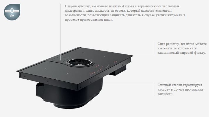 встроенная вытяжка, работает на отвод, максимальная мощность 1200 м3/ч, угольный фильтр не в комплекте |