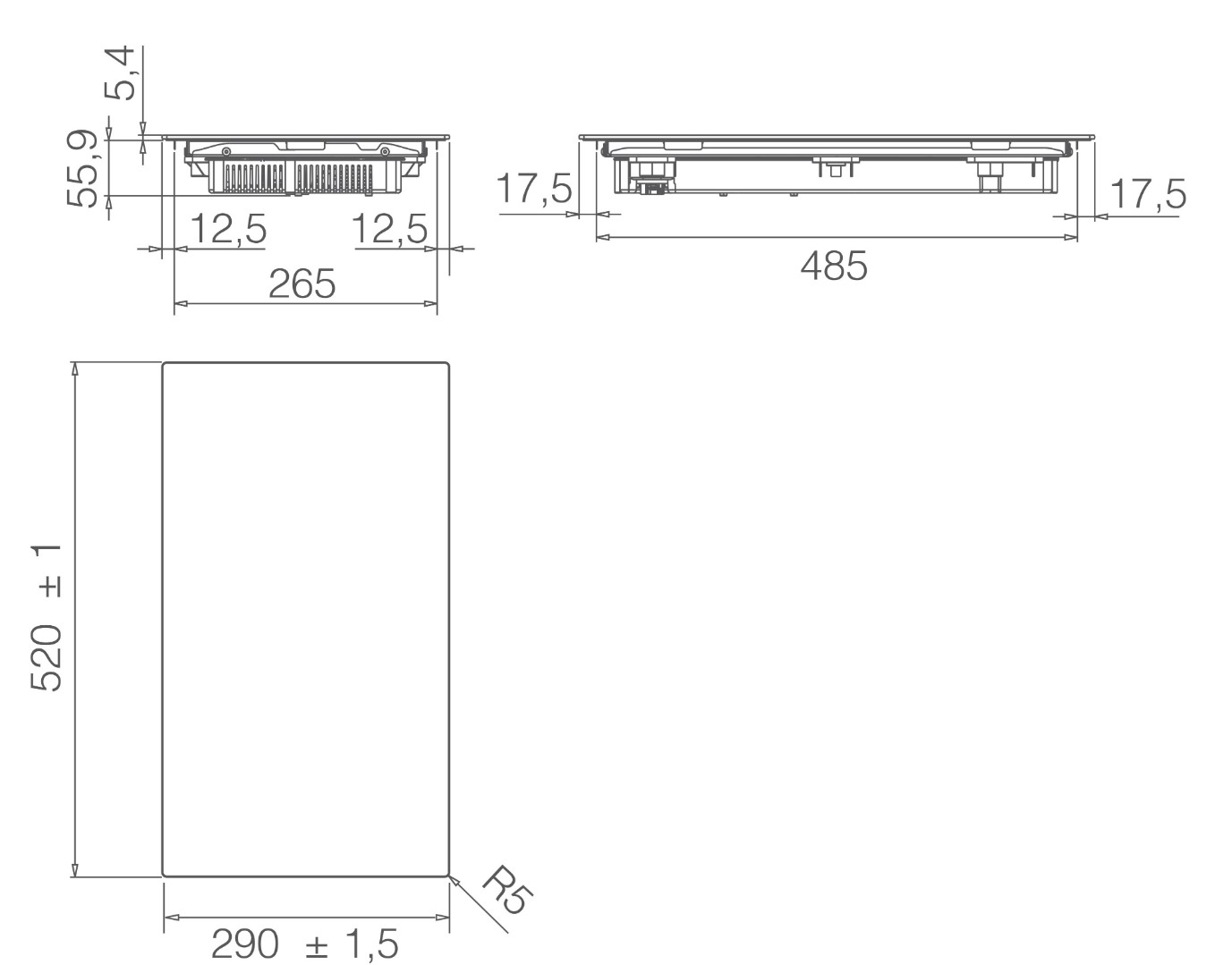 - Ближняя, левая конфорка: Ø 21 cm - 1,5/2 kW