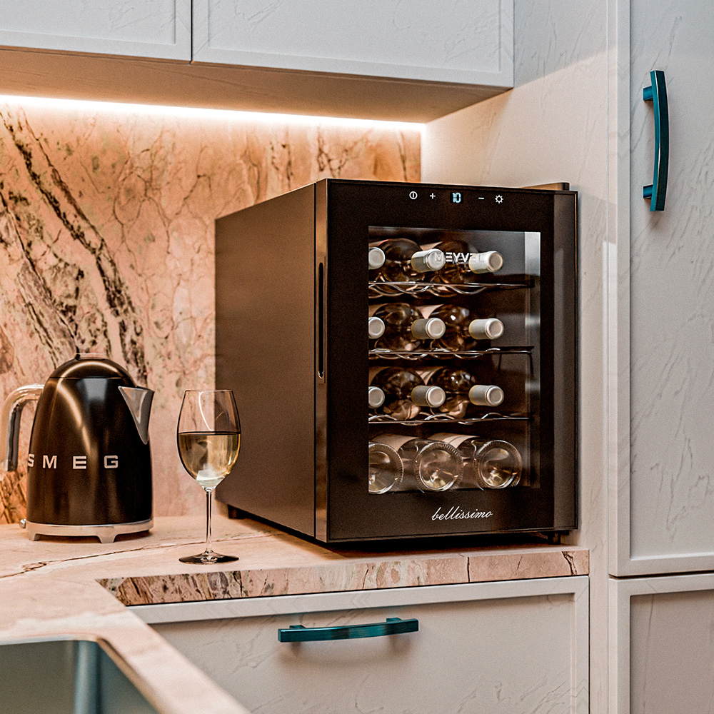 Несмотря на компактность, внутреннее устройство продумано до мелочей. Три металлические полки рассчитаны на стандартные бутылки «Бордо», а мягкая подсветка включается и выключается кнопкой, поэтому нужная бутылка найдётся даже вечером.