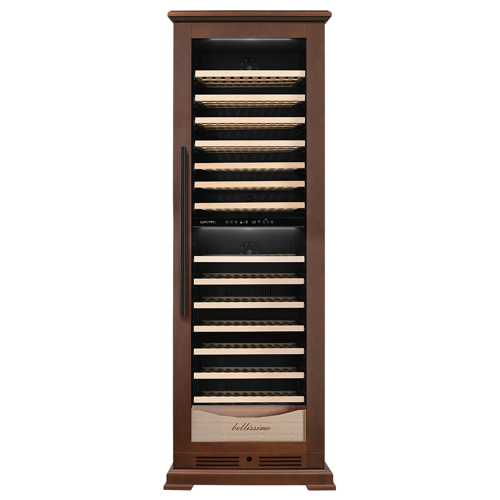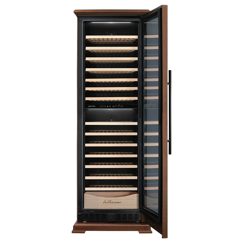 Винный шкаф предназначен для профессионального и длительного хранения различных сортов вин (до 174 бутылок типа Бордо). Он так же оснащен дверью с защитой от ультрафиолетовых лучей и поддерживает влажность в диапазоне 60-80%, как в настоящем винном погребе. Стальной корпус обшит натуральным буком, который выдерживает большие нагрузки и обладает красивой текстурой.