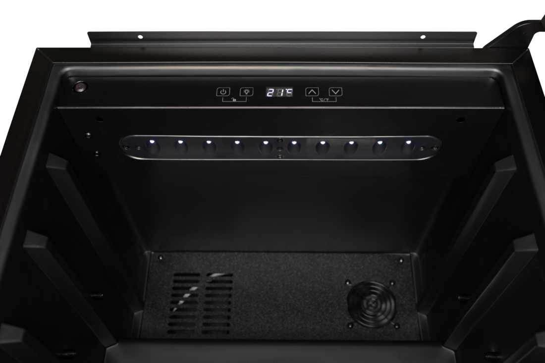 Особенности модели электронная система контроля температуры с сенсорными кнопками, открытие дверцы пуш-кнопкой, 2 съемные выдвижные полки из дерева (бук), электронная индикация температуры, стеклянная дверь с УФ-фильтром