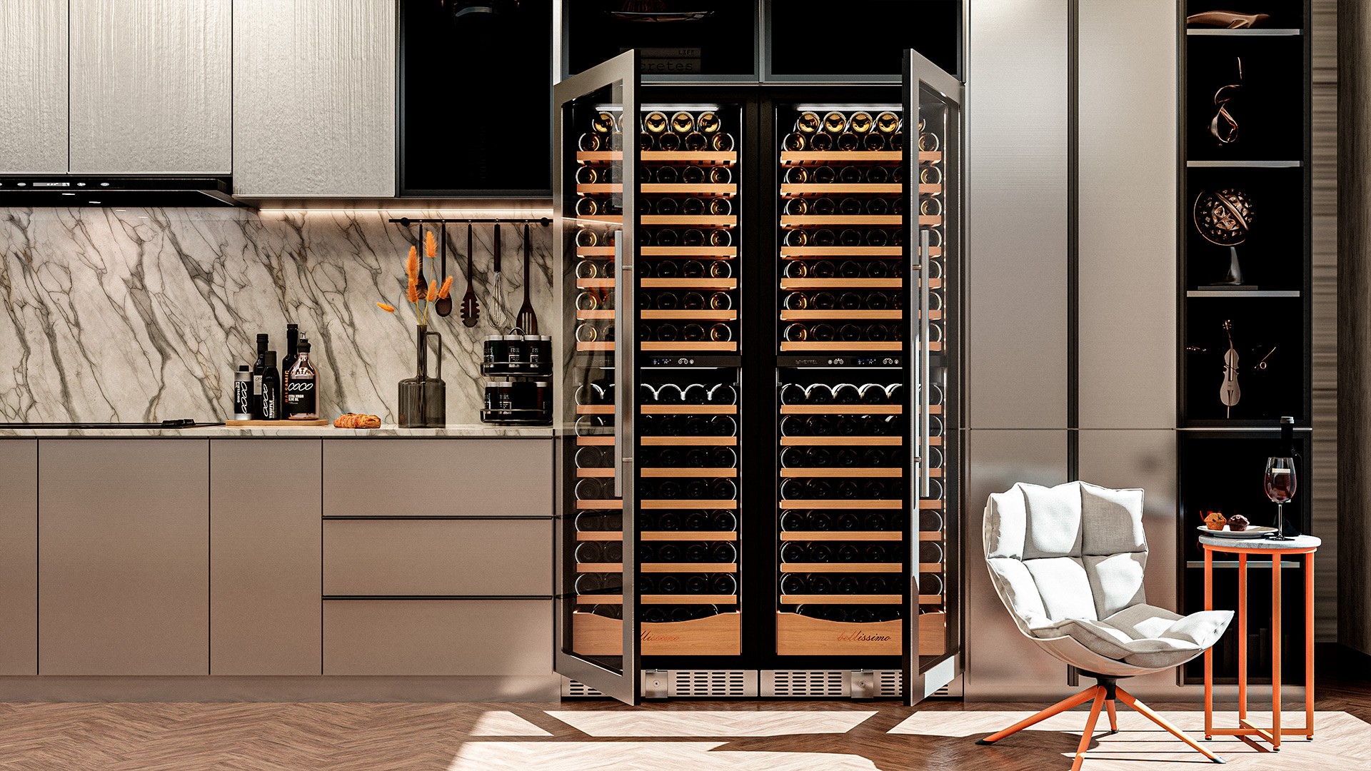 Винный шкаф предназначен для профессионального и длительного хранения различных сортов вин (до 174 бутылок типа Бордо). Он так же оснащен дверью с защитой от ультрафиолетовых лучей и поддерживает влажность в диапазоне 60-80%, как в настоящем винном погребе.