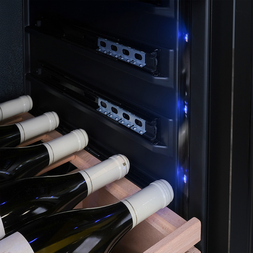 Несомненно, Вас порадует наличие панорамного светодиодного освещения (подсвечивает каждую полку), которое имеет три цвета - белый, янтарный и синий. Оно не выделяет тепло и следовательно - не нагревает бутылки с вином. Так что Вы сможете эффектно демонстрировать Вашу винную коллекцию.